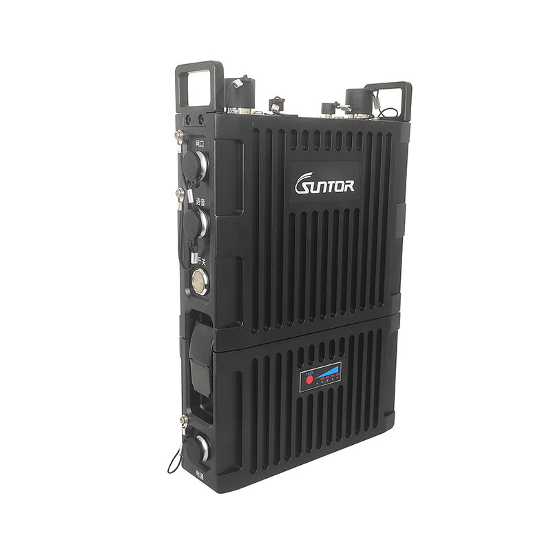Individual soldier mesh network transmission device featuring compact size, lightweight design, and high-capacity removable batteries. Engineered for easy backpack mounting, enabling hands-free operation for tactical personnel.